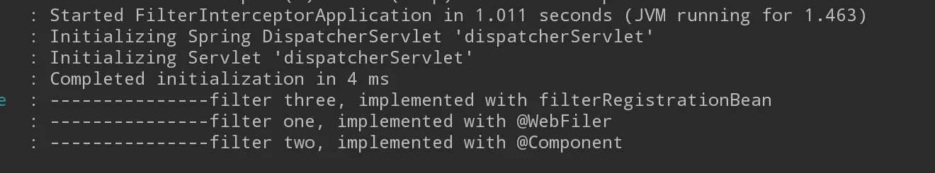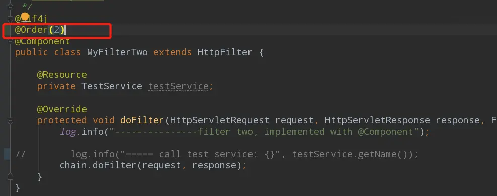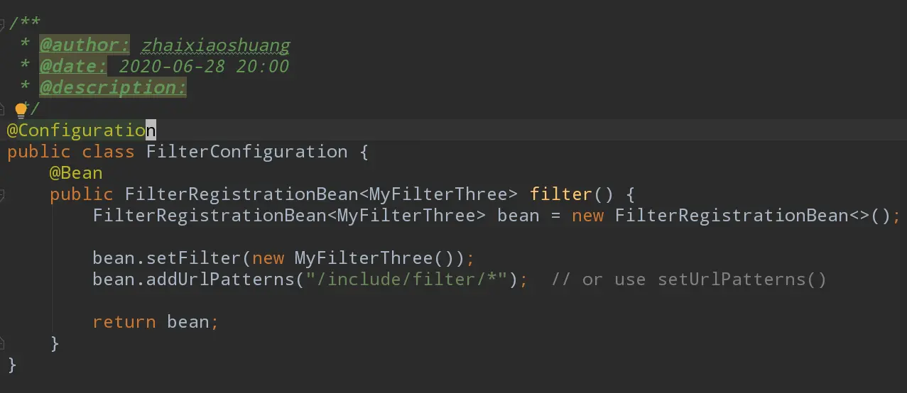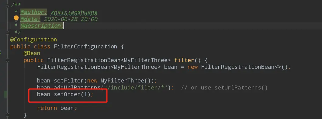 如果在程序中想定义多个filter,并且为不同的Filter指定顺序,则只能使用@Component注解和FilterRegistrationBean的方式。具体的使用请参见下图: