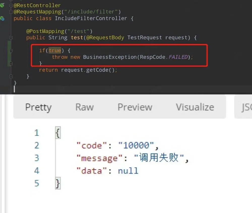 在实际项目中,我们通常会定义一个统一的返回信息格式,如果抛出异常,会通过全局统一的异常处理器,使得前端接收到的返回结果都是同一种格式,具体示例如下: