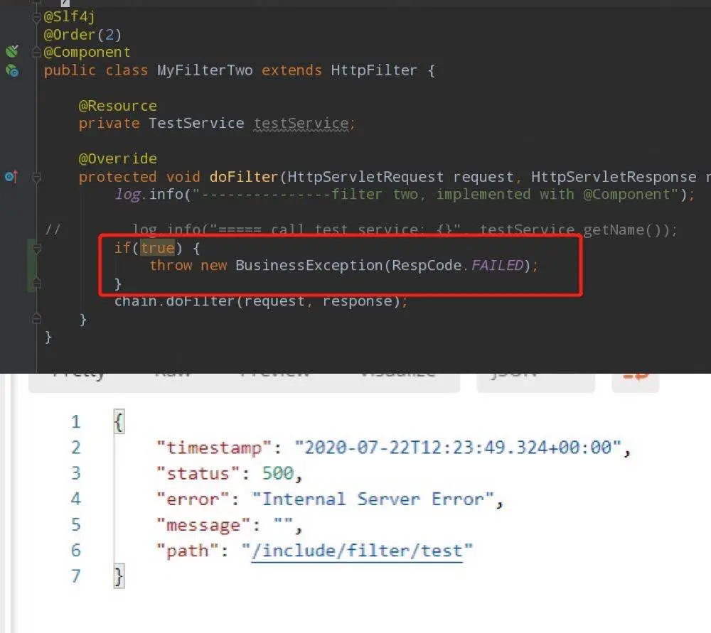 我们会看到在Filter中的异常并没有被我们的全局异常处理器捕捉到,所以也没有被处理成我们想要的统一格式,这是因为Filter并不在我们的Spring上下文中, 要想处理成我们统一定义的格式, 只能我们自己重写,具体示例如下面的代码所示: