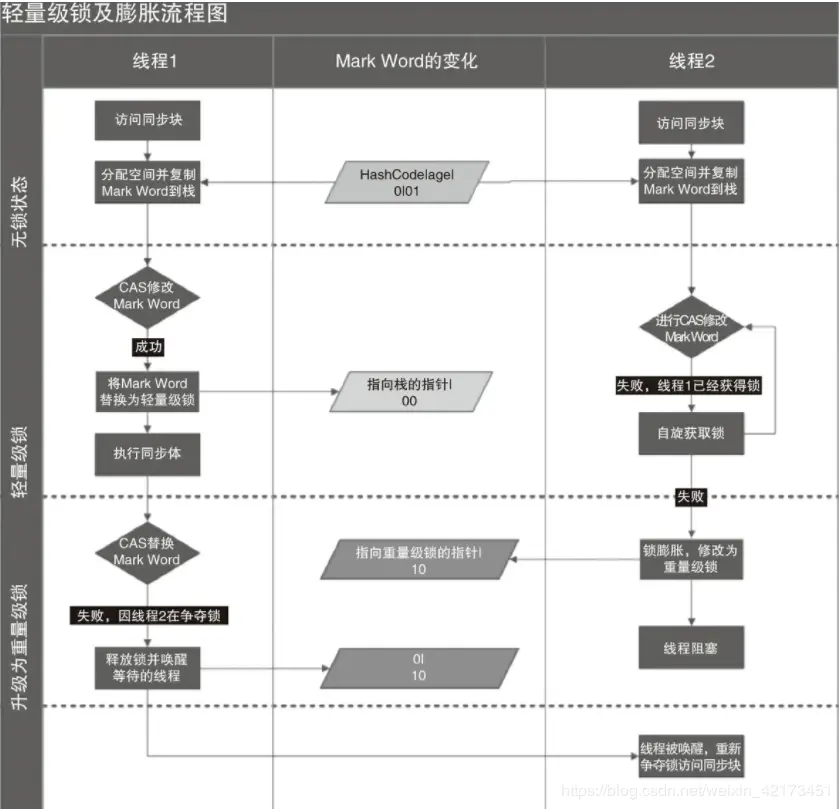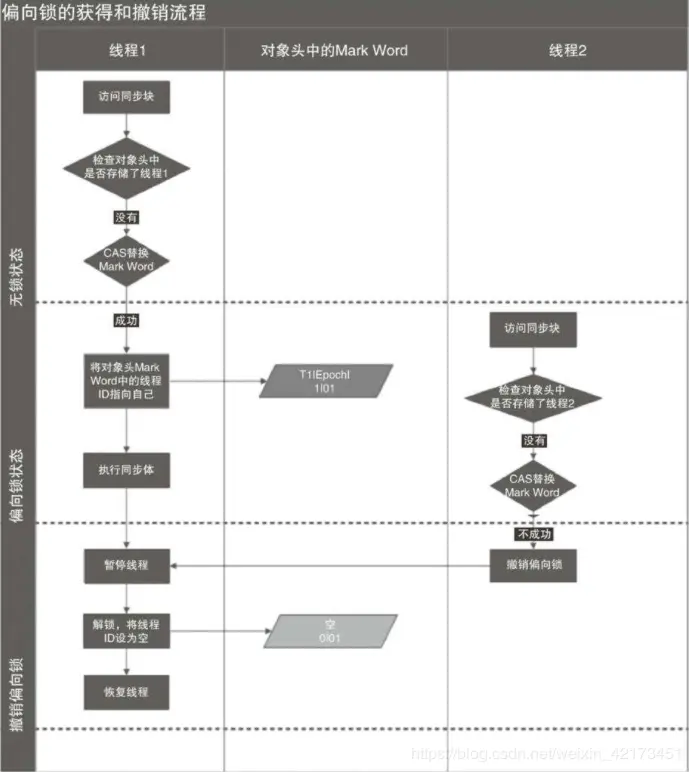 等待全局安全点(这个时间点上没有正在执行的字节码),在全局安全点上暂停当前拥有偏向锁的线程 检测当前线程是否处于活动状态,如果不处于活动状态,那么将对象头设置成无锁状态。如果线程仍然活着,则遍历它的栈中的关于该对象的锁记录,如果找到说明正在持有该锁,这时候就修改他们,让线程认为当前获取到的对象锁是轻量级锁,并且更改对象头中的Mark Word。如果没有持有该锁,那么对线头中Mark Word恢复到无锁状态或者标记对象不适合作为偏向锁 最后唤醒当前线程 以上流程可以看下图: