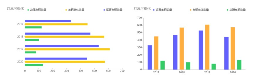 条形图/柱状图 条形图是用途最广泛,最常见的数据图形之一,它的作用主要是:条形图/柱状图适合用于少数类别(<10)的分类数据的可视化,用来反映不同类别数据之间的差异。 一些使用的建议:可以使用堆叠的条形/柱状,通过颜色区分数据,更好看出数据差异。