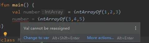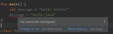 先看一段代码,当我们尝试给val声明的变量赋值的时候,编译器会报错,无法给val声明的变量赋值。由此可以说明,val引用自身是不可变的。