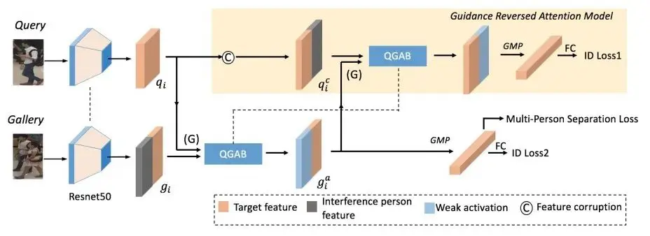 传统的行人重识别假设裁剪的图像只包含单人。然而,在拥挤的场景中,现成的检测器可能会生成多人的边界框,并且其中背景行人占很大比例,或者存在人体遮挡。从这些带有行人干扰的图像中提取的特征可能包含干扰信息,这将导致错误的检索结果。为了解决这一问题,本文提出了一种新的深层网络(PISNet)。PISNet首先利用Query图片引导的注意力模块来增强图片中目标的特征。此外,我们提出了反向注意模块和多人分离损失函数促进了注意力模块来抑制其他行人的干扰。我们的方法在两个新的行人干扰数据集上进行了评估,结果表明,该方法与现有的Re-ID方法相比具有更好的性能。