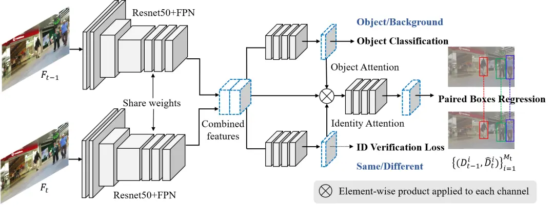 现有的多目标跟踪(MOT)算法大多是基于传统的先检测后跟踪的框架,包含目标检测、特征提取、目标关联这三个模块,还有少数MOT算法将三个模块中的某两个融合实现部分端到端跟踪,本文提出了一种链式跟踪算法Chained-Tracker(CTracker),业内首创两帧输入模式,可将上述三个模块集成至单个网络中,实现端到端联合检测跟踪,是第一个将跟踪算法中的目标关联问题转化为两帧检测框对(Box pair)回归问题的算法。网络的输入为相邻两帧,称之为节点(Chain node),网络的输出为表示同一个目标在相邻两帧中的检测框对,相邻节点的检测框对可通过共同帧关联。为进一步提高跟踪效果,我们还设计了联合注意力模块来突出检测框对回归中的有效信息区域,包括目标分类分支中的目标注意力机制和身份验证分支中的身份注意力机制。在不引入额外数据的情况下,CTracker在MOT16和MOT17上均获得了SOTA的结果,MOTA分别为67.6和66.6。