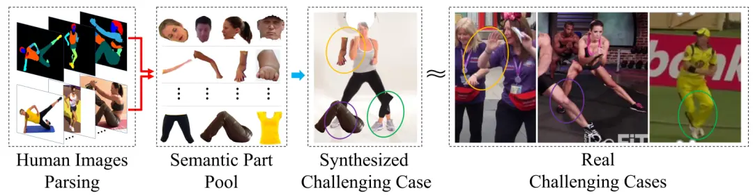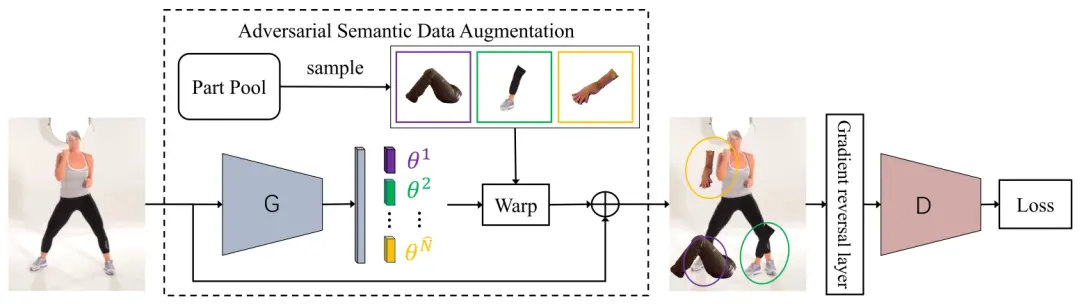人体姿态估计主要目的是定位人体的关键点坐标。目前的SOTA方法在严重遮挡、旁人干扰、对称相似三种困难场景中表现仍有待提升。一个主要的原因是这三种困难场景的训练数据较少。之前的方法主要是利用scale、rotation、translation等global spatial transform的方法去进行训练数据增强。这类常规的数据增强方法并不能对上述三种困难场景有提升和帮助。本文提出了一种Adversarial Semantic Data Augmentation(对抗语义数据增强方法)。该方法把人体分成多个有语义的部件,并对这些人体部件在不同的细粒度上进行重组,从而去模拟出上述三种困难场景。在重组人体部件的过程中,有多个空间变换参数来调节每一个人体部件,从而灵活的组合旁人遮挡、手臂交叉、复杂动作等情况。为了让人体姿态估计网络能更好的学习到对这些困难场景的鲁棒性,我们设计了另外一个生成网络(G)用于控制每个人体部件的空间变换参数,人体姿态估计网络作为判别网络(D)从G生成的困难样本里面去学习。G和D在训练过程中互相对抗。G网络不断的生成各种困难样本,以迷惑人体姿态估计网络。而人体姿态估计网络从这个对抗过程中也不断提升了自己对困难场景的预测准确性。