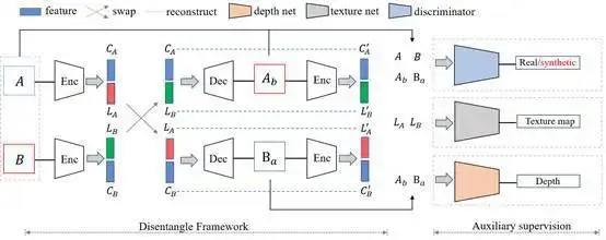 2、结合底层纹理特征约束和高层深度特征约束,进一步促进活体特征的解耦。