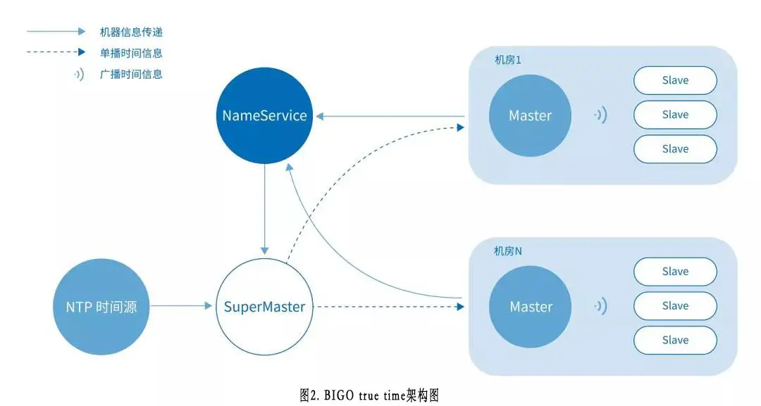 基于以上现状,结合BIGO的业务需求,我们的全球时钟true time服务开启调研和建设。在业界相关领域,google的spanner论文有提到true time服务的建设,facebook也有公开过chrony时钟对齐服务解决方案。前者核心是依赖全球多机房部署原子钟+GPS构建了一个双层的架构,配合Marzullo变种算法来提供7ms时间区间服务。而后者本质上也是基于原子钟+GPS构建了一个最高可以达到16层的架构来提供true time服务。