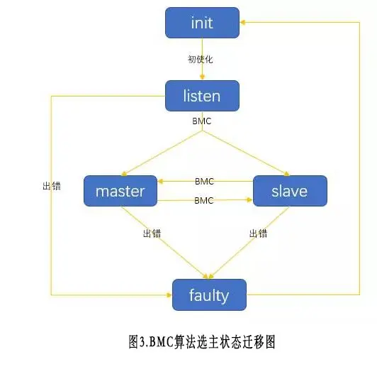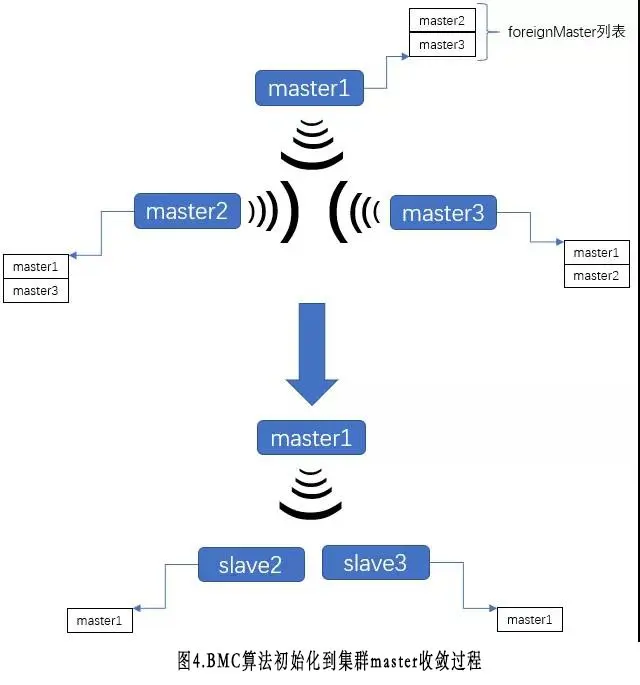 2)进程根据foreignMaster列表信息(可能为空)和本进程信息通过BMC算法按机器属性选择出最优的master;