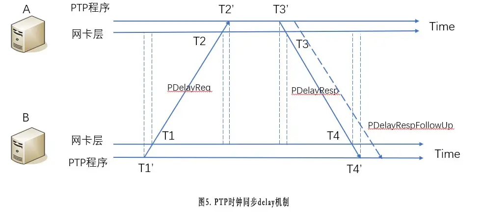 图5为PTP时钟delay机制的同步过程,该过程重点解决一个问题:工程上精准算A到B的网络时延delay值。