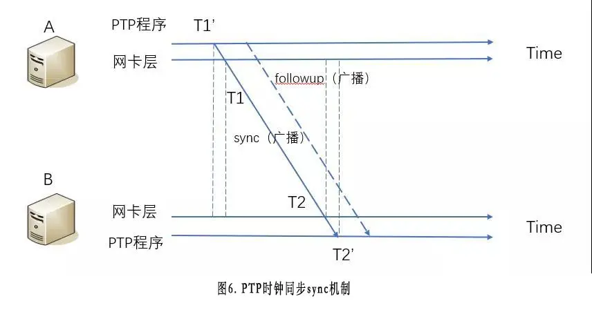 图6为PTP时钟同步的sync过程,该过程运行时,B已经成功获取到A到B的网络时延dealy。此时A作为master主动广播sync请求帮助B精准测算出A,B本地时钟差值offset。