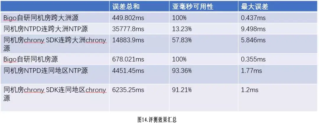 前面3行是跨大洲场景的表现,以前面定义的可用性而言,ntpd和chrony直接使用都无法满足我们的可用性需求,而最大误差这块,BIGO自研架构下的机器时钟误差控制在0.5ms内,而直接接入ntpd有近10ms最大误差,接入chrony的误差接近6ms。