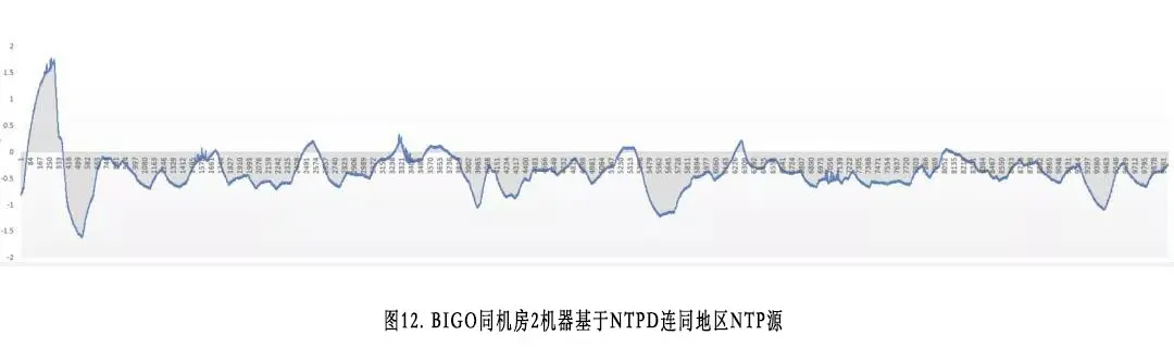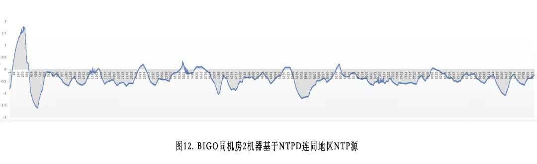 图8~图13为我们观测BIGO同机房机器,基于不同算法和不同区域源时钟同步之后,取得的误差表。全部场景都观测了3个小时,每秒观测一次,每张图都是1万个横轴坐标点。需要注意的是,ntpdate本身明显过于粗糙,我们认为不值得浪费时间进行对比,所以这里只对比了ntpd和facebook的chrony。