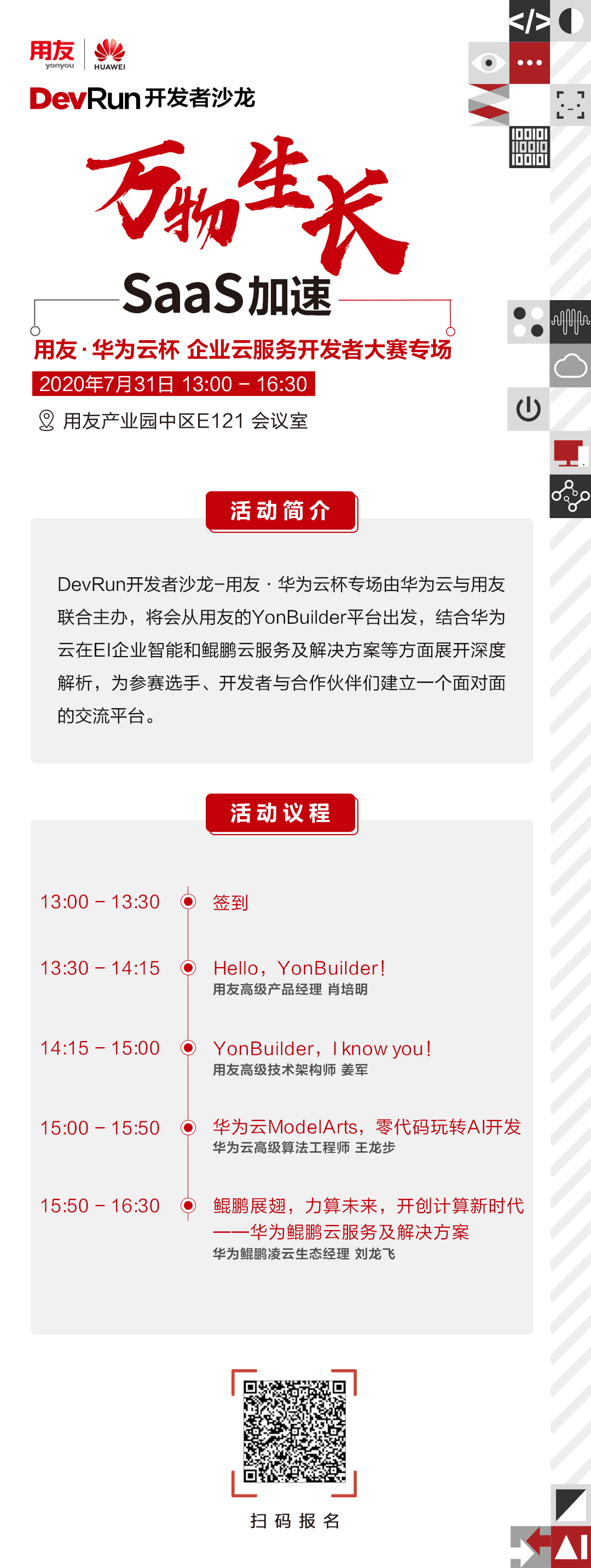 开发者沙龙 我是路人 2020-07-23 146 阅读1分钟 开发者沙龙,用友——华为联合举办的线下沙龙,七月三十一日用友产业园中区121会议室,还有各种互动活动。 开发者沙龙将会从用友的YonBuilder平台出发,结合华为云在EI企业智能和鲲鹏云服务及解决方案等方面展开深度解析,为参赛选手、开发者与合作伙伴们建立一个面对面的交流平台。 用友高级产品经理、高级技术架构师、华为云高级算法工程师、华为云鲲鹏生态经理等您一起分享交流,机会难得! YonBuilder低代码开发平台,带您一起玩转开发!