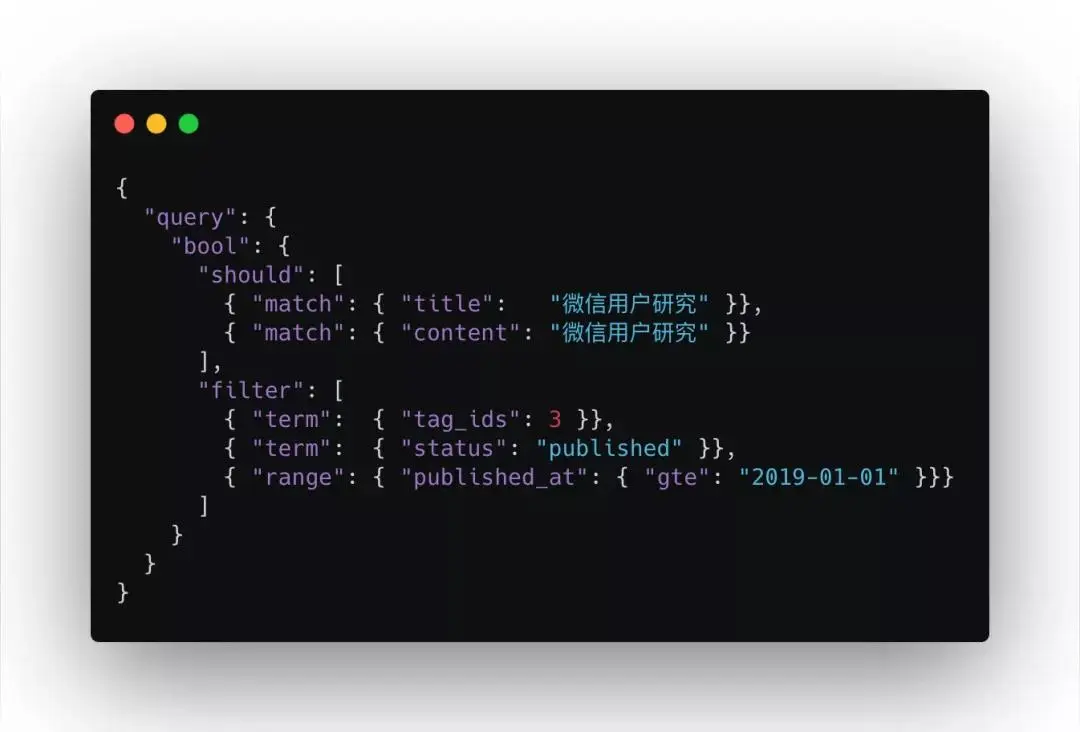 一般一个文档拥有多个可以被筛选的属性,例如 id、时间、标签、分类等。为了搜索的质量我们应该认真地对文档进行打标签和分类处理,因为一旦选择了过滤,即使用户的搜索关键词再匹配文档也不会被返回了。示例 Query DSL 如下: