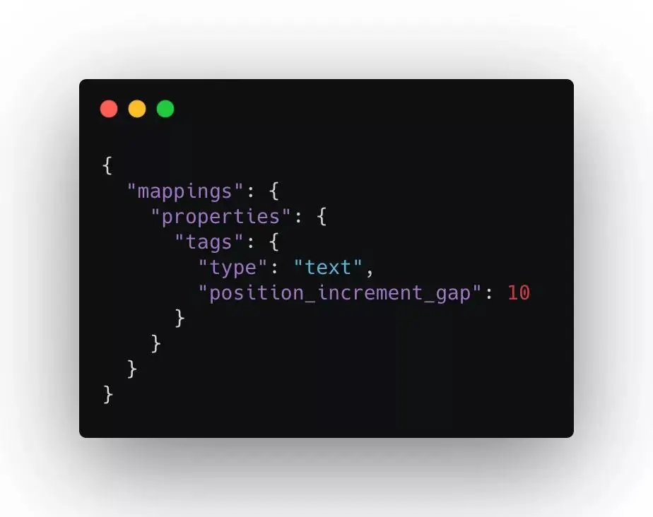 这种情况是不应该发生的,我们应该在设置索引mappings时,给 tags 字段设置上 position_increment_gap ,来增加数组元素之间的位置,此位置要超过查询所使用的 slop,例如: