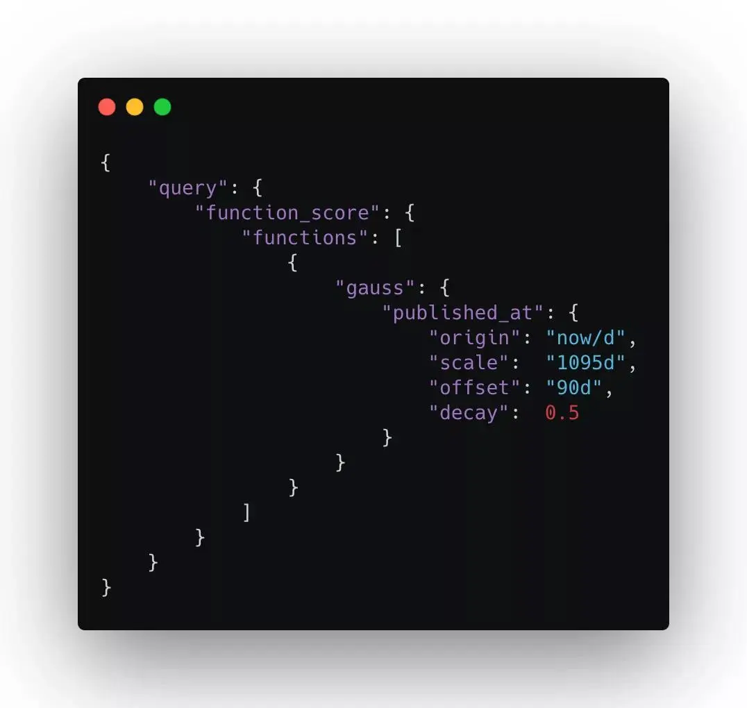 假定搜索引擎中三年内的文档会比较重要,三年之前的信息价值降低,就可以选择 origin 为今天,scale 为三年,decay 为 0.5,offset 为三个月,DSL 如下: