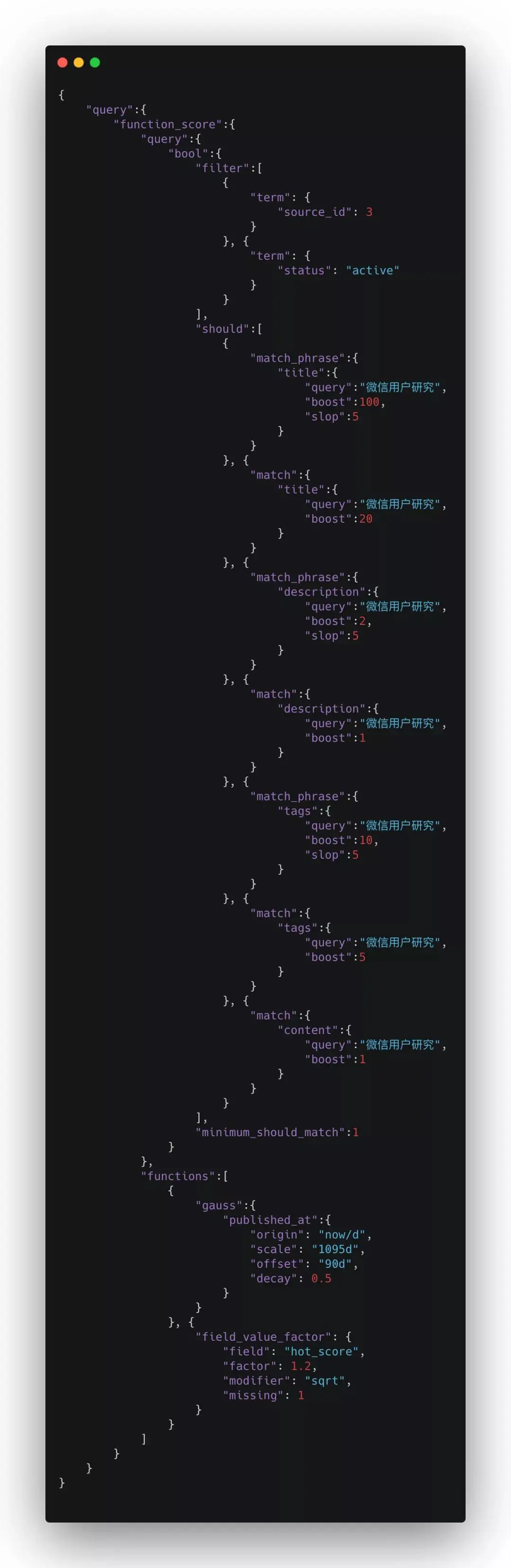 到这里我们的 Query DSL 已经优化的差不多了,现在的搜索结果终于可以让人满意了。我们来看一下最终的DSL语句示例:(示例并非实际运行的代码)