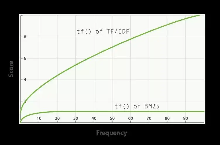 k1 这个参数控制着词频结果在词频饱和度中的上升速度。默认值为 1.2 。值越小饱和度变化越快,值越大饱和度变化越慢。词频饱和度可以参看下面官方文档的截图,图中反应了词频对应的得分曲线,k1 控制 tf of BM25 这条曲线。