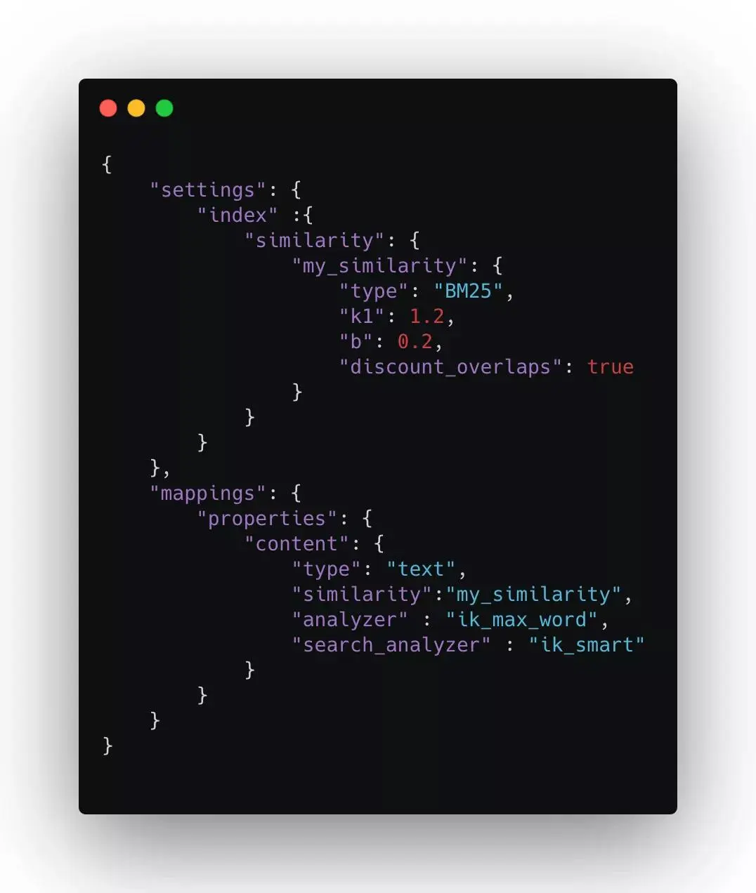 根据 k1 和 b 的描述,我们将 BM25 模型中的 b 值从默认的 0.75 降低,具体降低到多少才合适,还需要进一步的尝试。这里我以调整到 0.2 为例,写出对应的 settings 和 mappings :