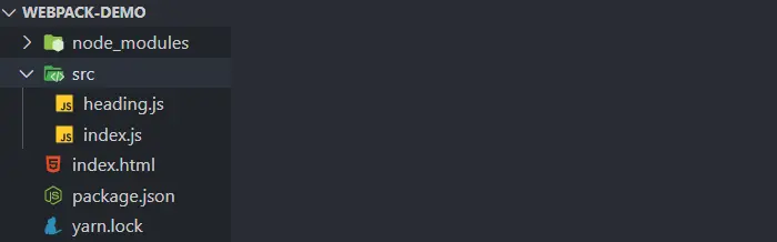 yarn webpack命令, 接着我们的根目录下就有一个为dist文件,里面有个main.js,然后我们将index.html中的属性修改为dist文件,打开就可以直接看到我们创建的一个h1标签了 - 为了每次打包使用方便,我们还可以在package.json中配置scripts,这样我们就后面就可以直接执行