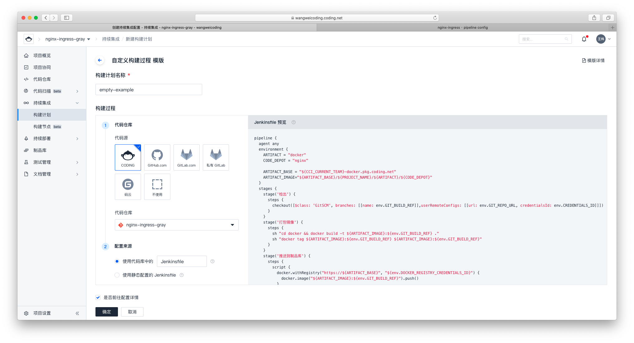 使用“自定义构建过程”创建构建计划,并选择使用代码仓库的 Jenkinsfile