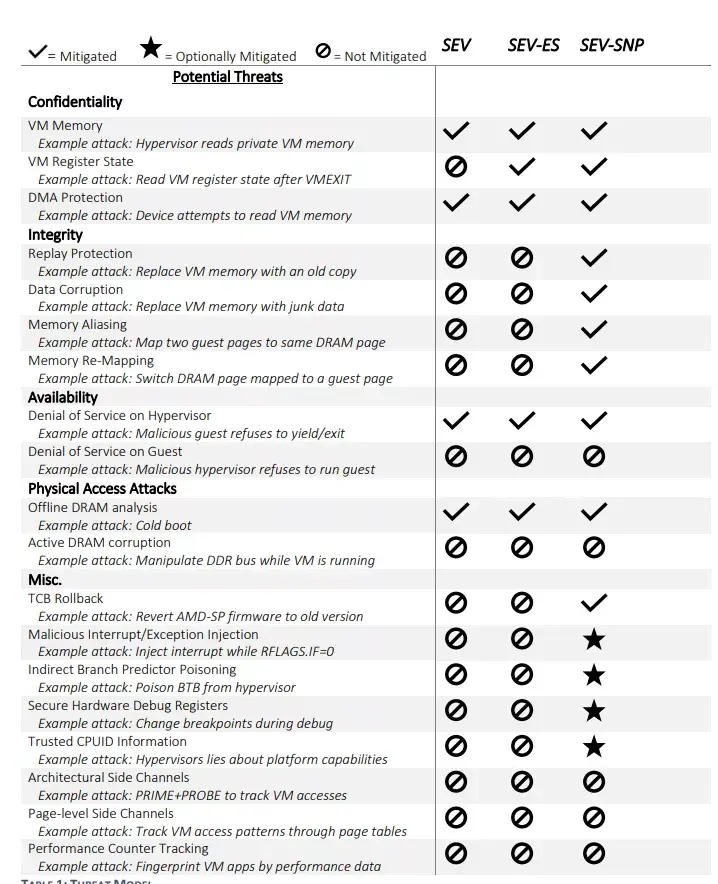 在后端,机密虚拟机使用了基于 AMD 二代霄龙处理器(EPYC)[4]的安全加密虚拟化技术,实现了使用状态下数据的加密。密钥由 CPU 可信执行环境生成且无法导出,即便是谷歌自身也无法得知密钥。