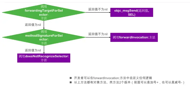 forwardingTargetForSelector方法,如果实现了该方法,且返回值不为空的话,继续objc_msgSend并把上面的返回值作为第一个参数传进去。 - 如果不满足上面条件,会调用methodSignatureForSelector,获取方法签名。