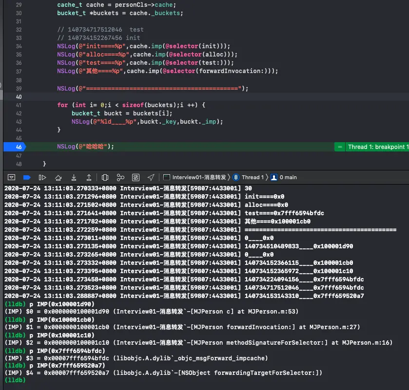 (IMP) $1 = 0x0000000100001cb0 (Interview01-消息转发`-[MJPerson forwardInvocation:] at MJPerson.m:27)