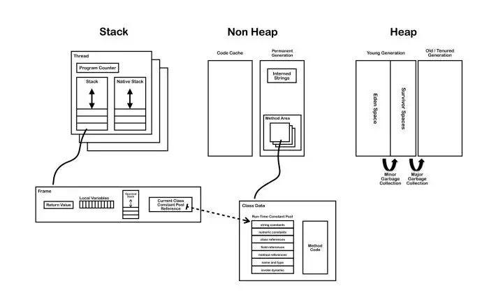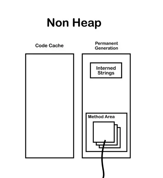 这张图中,可以看到,方法区实际上是在一块叫“非堆”的区域包含——可以简单粗略的理解为非堆中包含了永生代,而永生代中又包含了方法区和字符串常量池。