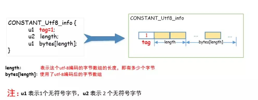首先是1个字节的tag,表示这是一个CONSTANT_Utf8_info结构的常量,然后是两个字节的length,表示要储存字节的长度,之后是一个字节的byte数组,表示真正的储存的length个长度的字符串。这里需要注意的是,一个字节只是代表这里有一个byte类型的数组,而这个数组的长度当然可以远远大于一个字节。当然,由于CONSTANT_Utf8_info结构只能用u2即两个字节来表示长度,因此长度的最大值为2byte,也就是65535。