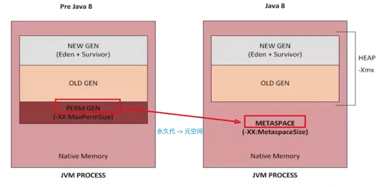 JDK 8以后: 逻辑上分为新生区+养老区+元空间(即Xms/Xmx分配的内存物理上没有涉及元空间