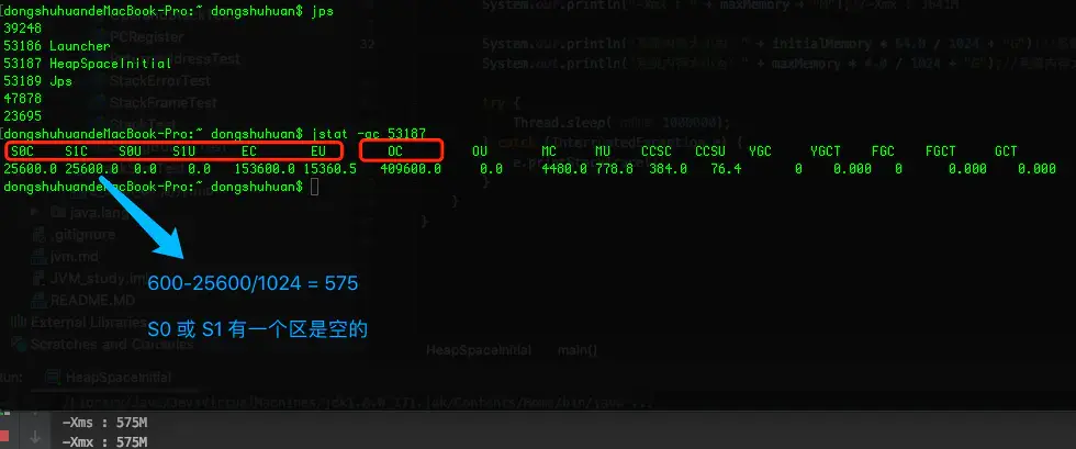 设置堆大小为600m,打印出的结果为575m,这是因为幸存者区S0和S1各占据了25m,但是他们始终有一个是空的,存放对象的是伊甸园区和一个幸存者区。