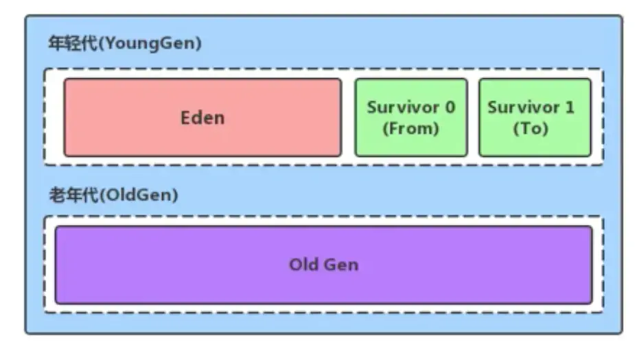 Java堆区进一步细分可以分为年轻代(YoungGen)和老年代(OldGen)。其中年轻代可以分为Eden空间、Survivor0空间和Survivor1空间(有时也叫frmo区,to区)