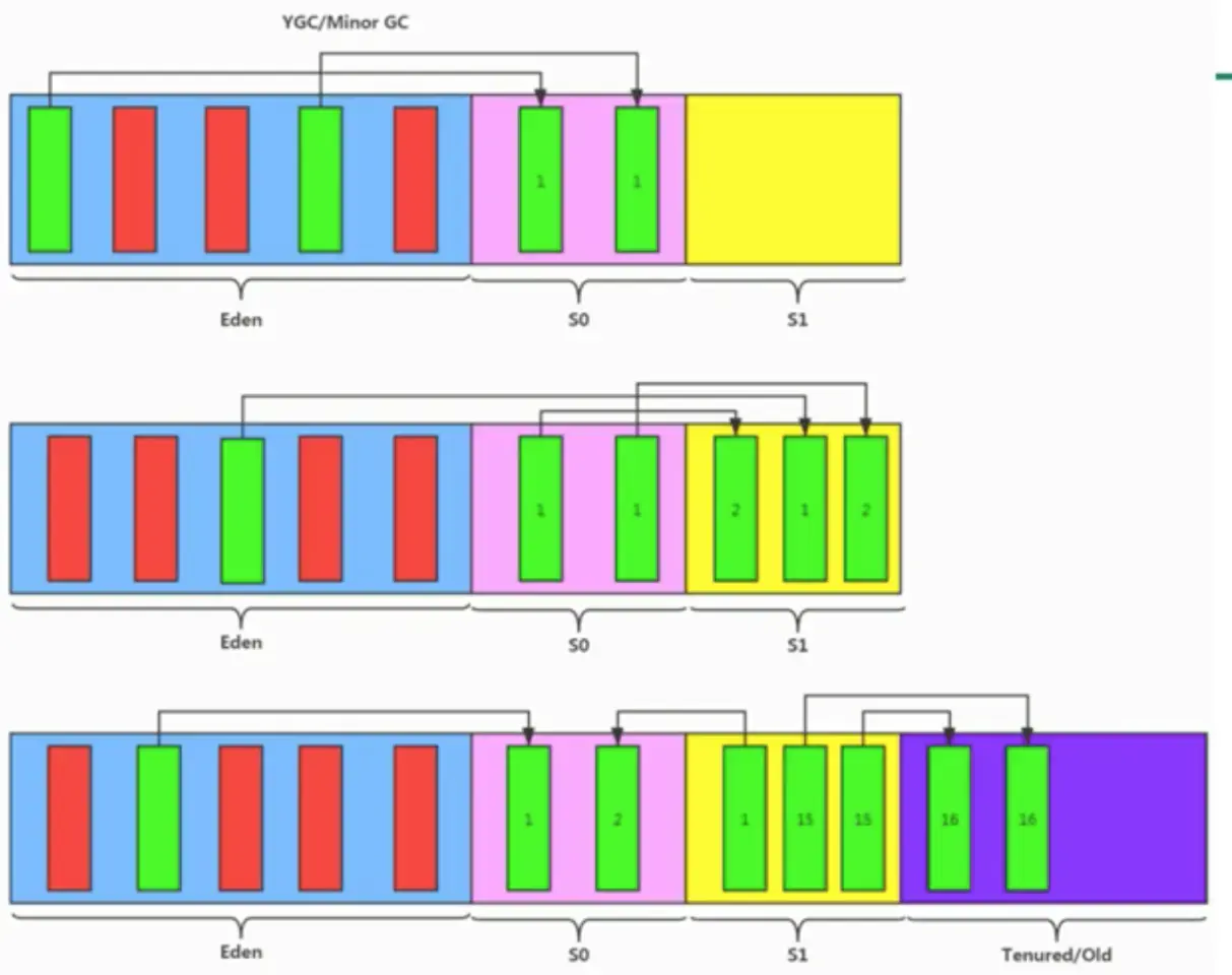 - 年轻代是对象的诞生、省长、消亡的区域,一个对象在这里产生、应用、最后被垃圾回收器收集、结束生命