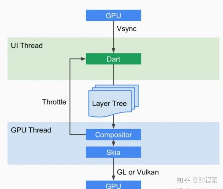 这张图解释得更清晰一些:Flutter只关心向 GPU提供视图数据,GPU的 VSync信号同步到 UI线程,UI线程使用 Dart来构建抽象的视图结构,这份数据结构在 GPU线程进行图层合成,视图数据提供给 Skia引擎渲染为 GPU数据,这些数据通过 OpenGL或者 Vulkan提供给 GPU。