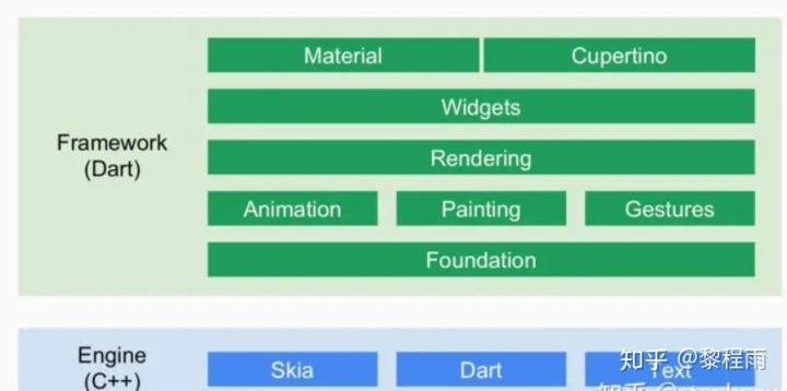 2.Engine使用C++实现,主要包括:Skia,Dart和Text。Skia是开源的二维图形库,提供了适用于多种软硬件平台的通用API