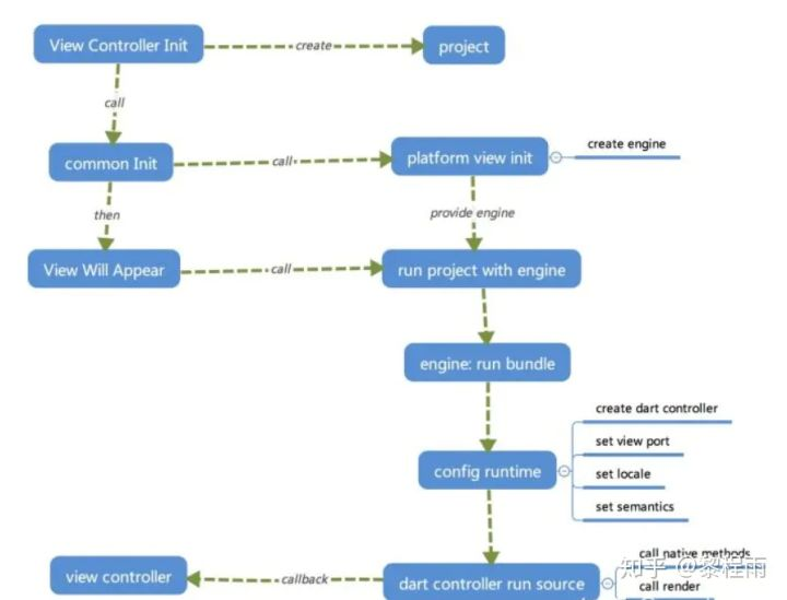 - 在应用的 View Controller 初始化后,会实例化一个 Flutter project的抽象(以下简称 project)。project会初始化一个 platform view的抽象实例,这个抽象实例会负责创建 Flutter 的运行时(以下简称 engine)。