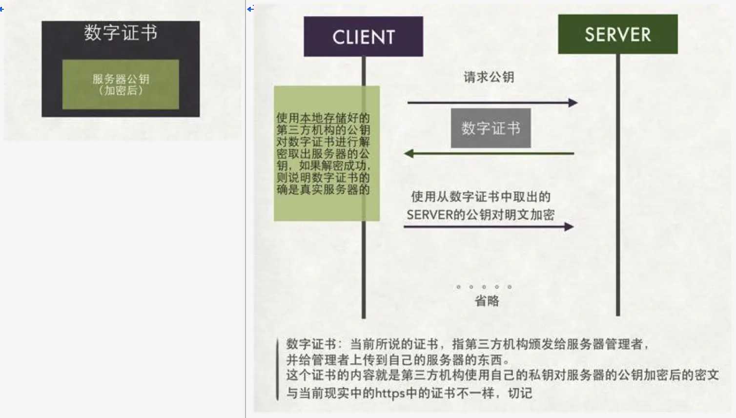 到上面这一步,最关键的问题是,客户端如何知道给我公钥的是黄蓉还是小龙女?只能找本人去证实?或者有一个第三者来帮你证实,并且第三者是绝对公正的。 所以,引入一个可信任的第三者是一个好的方案 服务端把需要传递给客户端的公钥,通过第三方机构提供的私钥对公钥内容进行加密后,再传递给客户端? 通过第三方机构私钥对服务端公钥加密以后的内容,就是一个简陋版本的 “数字证书”。这个证书中包含【服务器公钥】