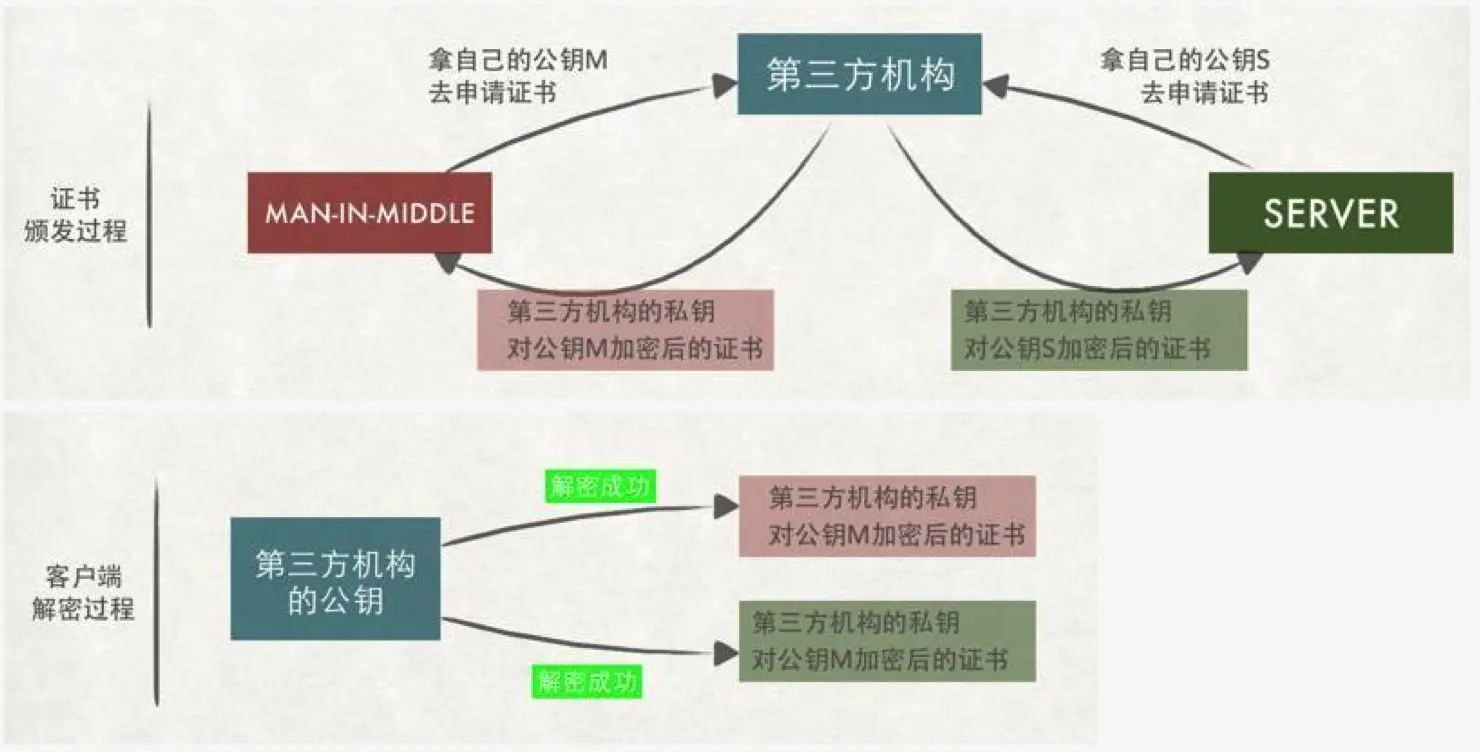 如果不法分子也申请了证书,那它可以对证书进行调包。客户端在这种情况下是无法分辨出收到的是你的证书,还是中间人的。因为不论是中间人的、还是你的证书都能使用第三方机构的公钥进行解密。
