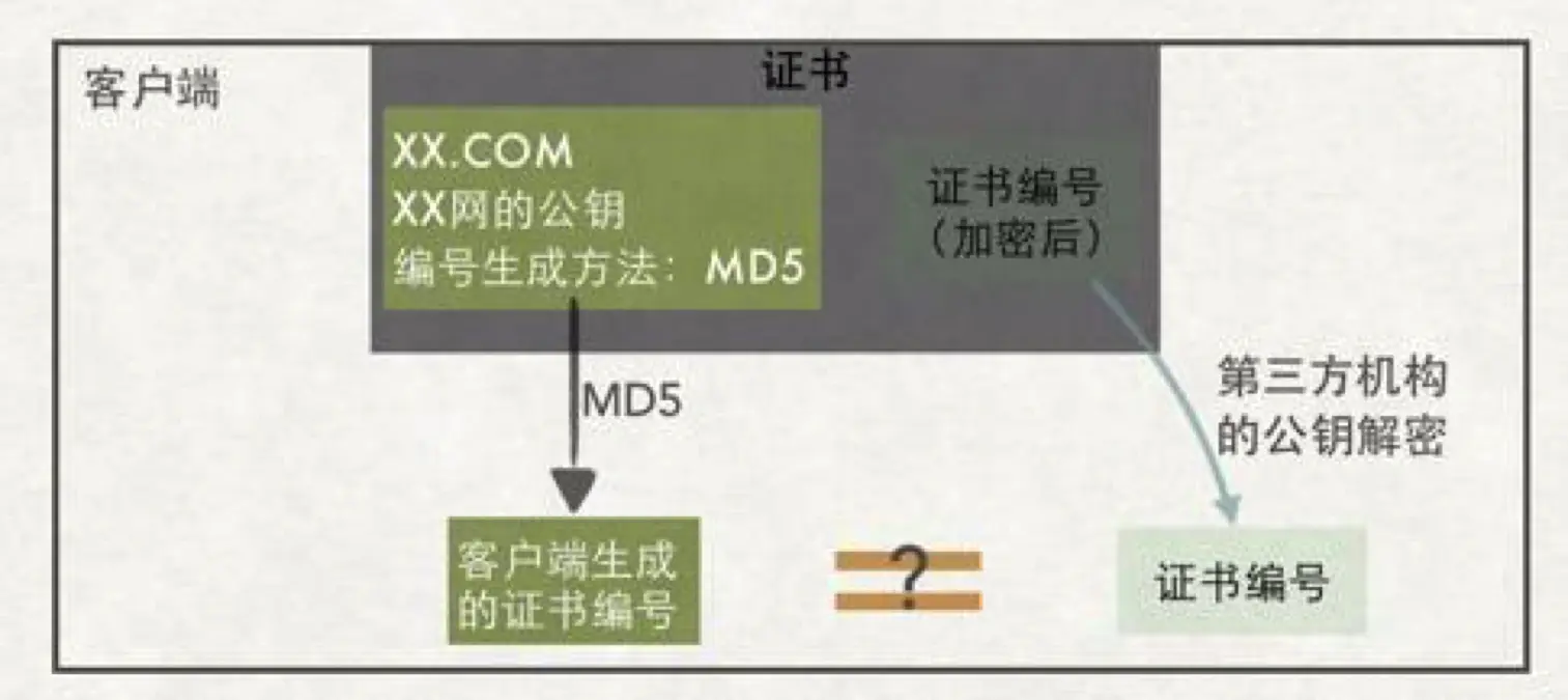 事情发展到现在,问题演变成了,客户端如何识别证书的真伪?在现实生活中,要验证一个东西的真伪,绝大部分都是基于编号去验证(比如大学毕业证书,比如买的数码产品是否是山寨),我之前讲过,计算机领域的解决方案都是人为去实现的,所以在这里,解决方案也是一样,如果给这个数字证书添加一个证书编号?是不是就能达到目的呢? 证书上写了如何根据证书的内容生成证书编号。客户端拿到证书后根据证书上的方法自己生成一个证书编号,如果生成的证书编号与证书上的证书编号相同,那么说明这个证书是真实的。 这块有点类似于 md5 的验证,我们下载一个软件包,都会提供一个 md5 的值,我们可以拿到这个软件包以后通过一个第三方软件去生成一个 md5 值去做比较,是不是一样如果一样表示这个软件包没被篡改过