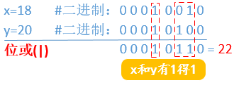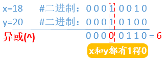 >>> x = 18 >>> y = 20 >>> print('x | y 结果是:', x | y) # 输出结果如下: x | y 结果是: 22异或(^) 说明:异或(^)是以二进制计算两者位都有