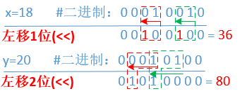 >>> x = 18 >>> y = 20 >>> print('x ^ y 结果是:', x ^ y) # 输出结果如下: x ^ y 结果是: 6左移(<<) 左移(<<)是整体向最高位(左边)移动位数。