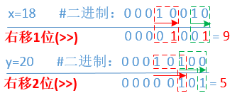 >>> x = 18 >>> y = 20 >>> print('x 左移1位的结果是:', x << 1) >>> print('y 左移2位的结果是:', y << 2) # 输出结果如下: x 左移1位的结果是: 36 y 左移2位的结果是: 80右移(>>) 右移(>>)是整体向最低位(右边)移动位数。