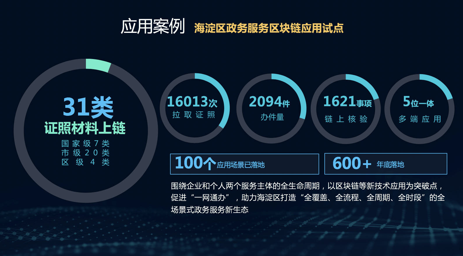 目前,百度超级链联合中科大脑承接北京政务服务区块链技术海淀区应用试点。海淀区试点中围绕企业和个人两个服务主体的全生命周期,以区块链等新技术应用为突破点,促进“一网通办”,助力海淀区打造“全覆盖、全流程、全周期、全时段”的全场景式政务服务新生态。