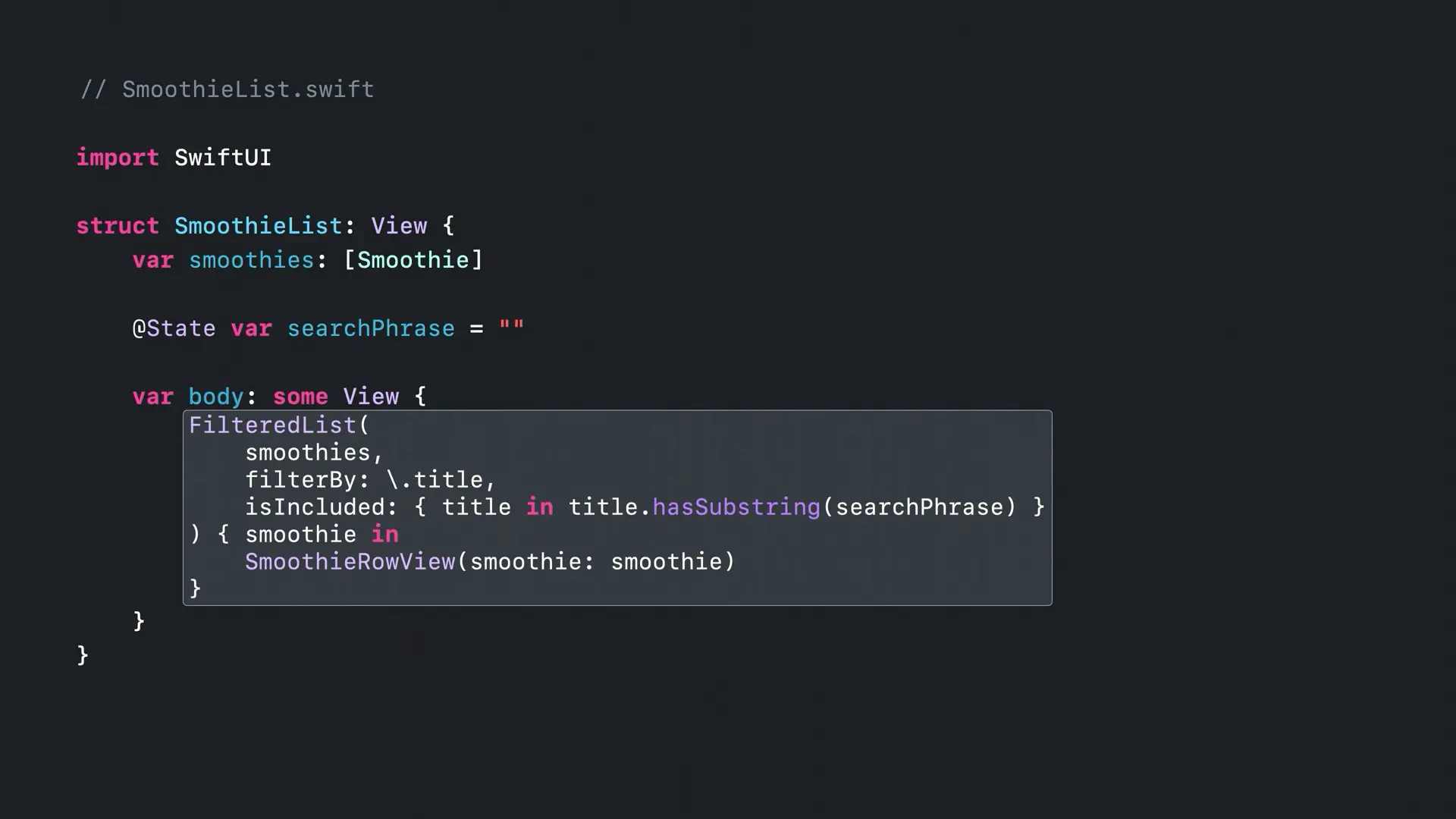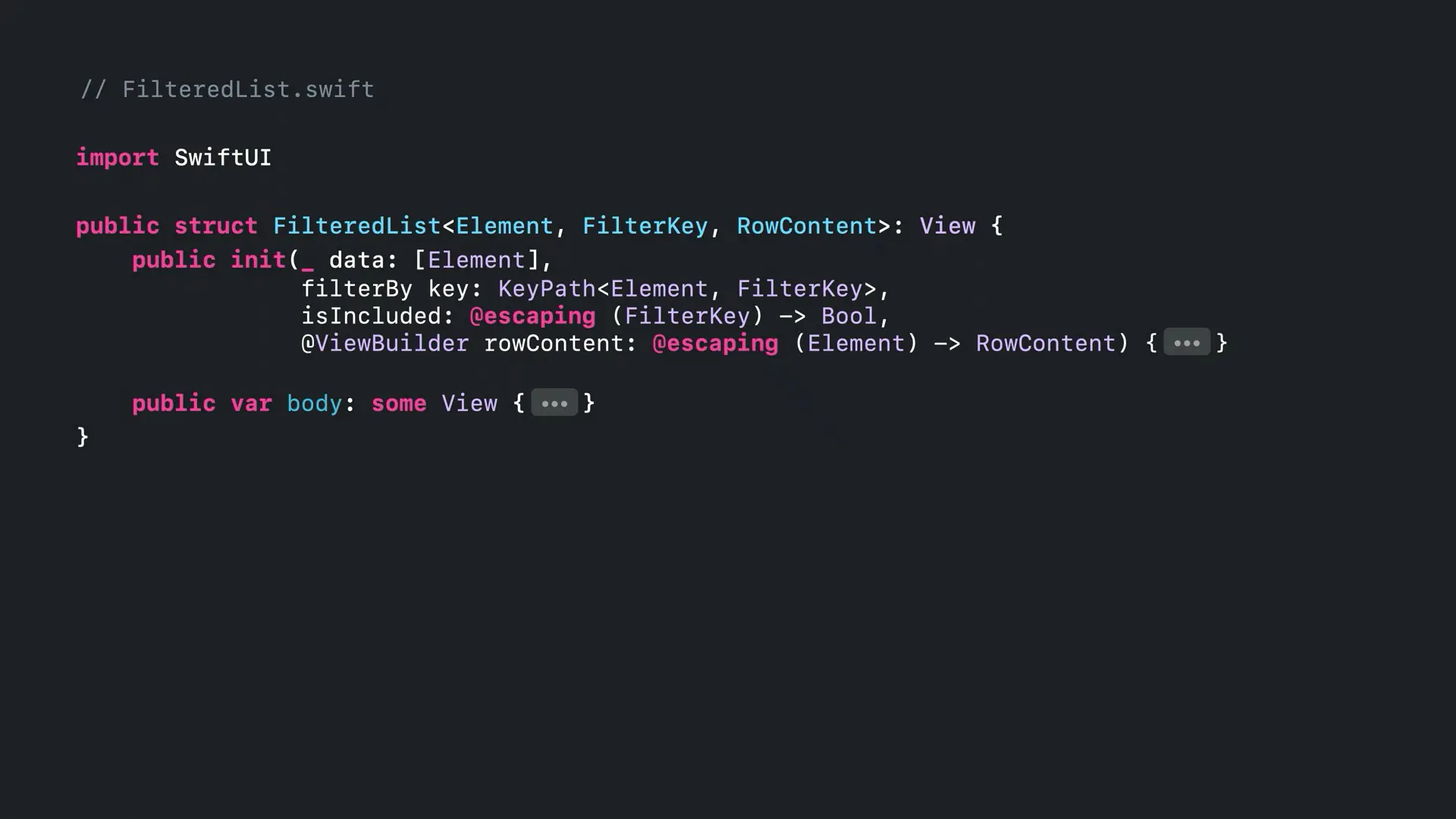 现在只剩下了 RowContent,由于闭包只返回一个子视图 SmoothieRowView,那么显而易见,范型 RowContent 表示 SmoothieRowView 类型,至此我们找到了所有的拼图🧩。