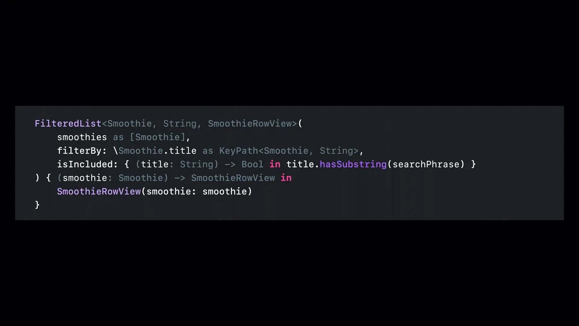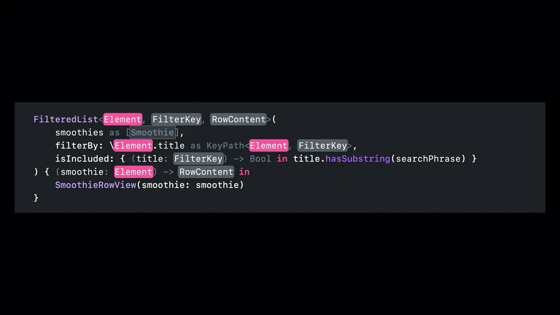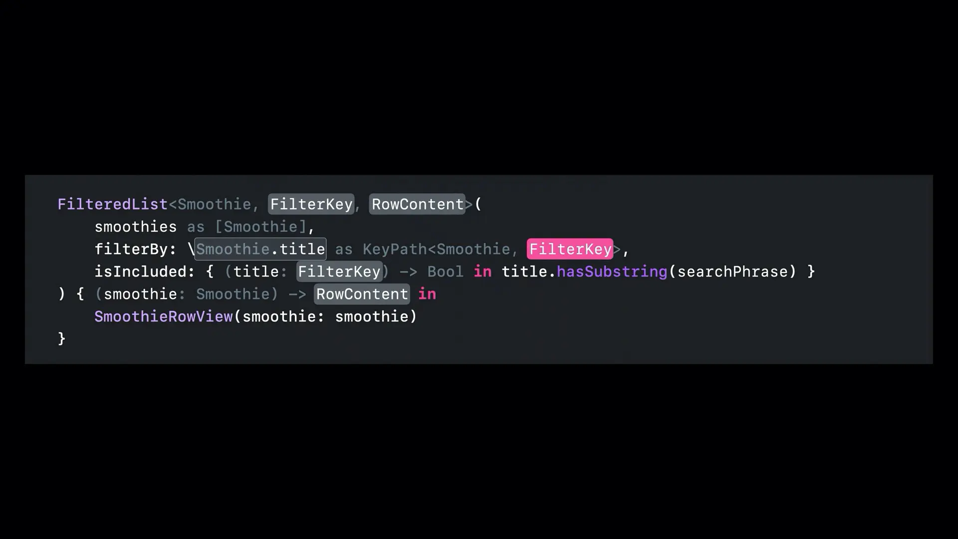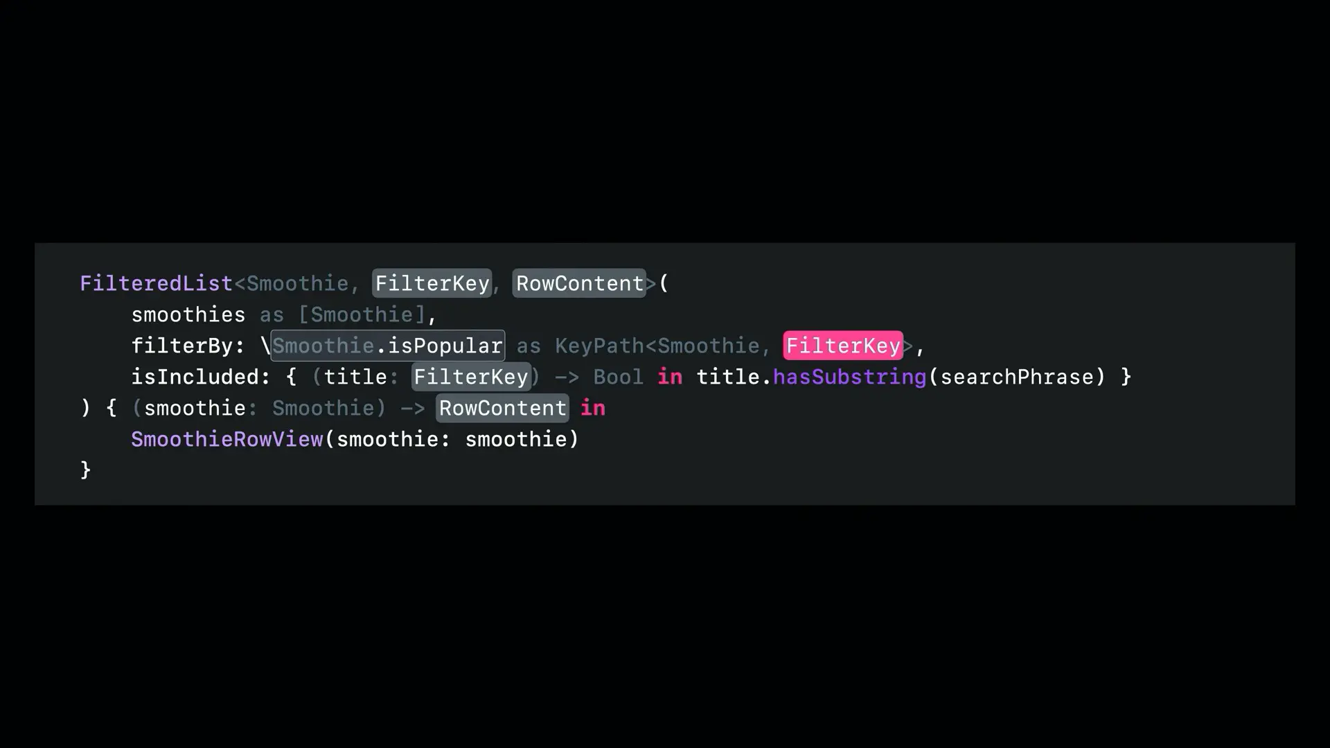 还是上面的例子,假如我们把 \Smoothie.title 替换为 \Smoothie.isPopular,其中 isPopular 一个 Bool 值。继续按照上面的方式填充拼图,此时范型 FilterKey 表示 Bool 类型: