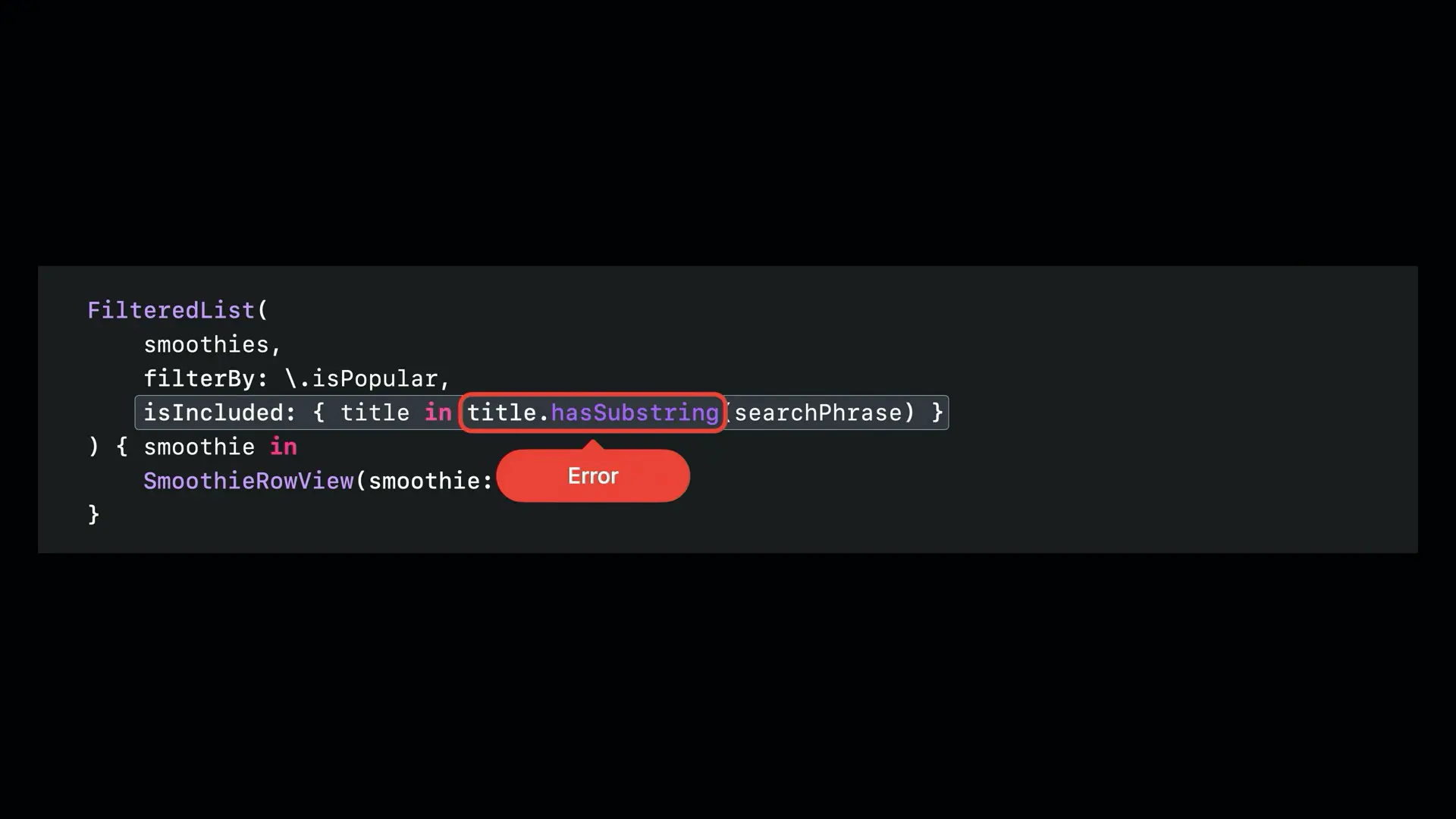 那么在 isIncluded 闭包中,title 也对应 Bool 类型,但是 Bool 类型是没有 hasSubstring 方法的,拼图无法继续,编译器提示错误: