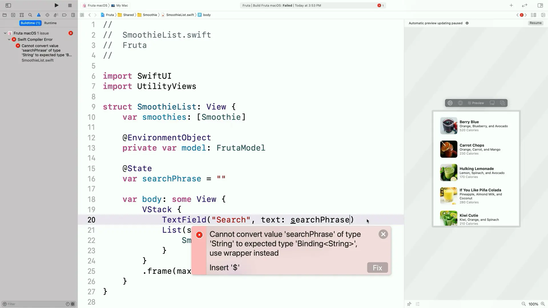为了方便后续分析编译器为此做了什么,我们先看看Session中给的例子,一款名为Fruta的订购冰沙应用(这个demo在很多Session中都有出现😂)。