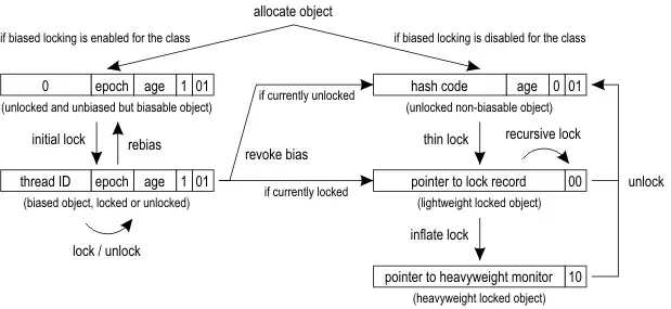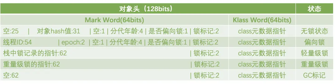 其中锁标记的值分别是:无锁=001,偏向锁=101,轻量级锁=000,重量级锁=010。