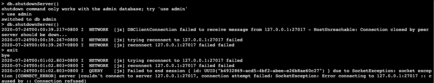 use admin db.auth('root','root') db.shutdownServer()千万注意:使用 kill 直接杀死 会造成很大的问题